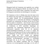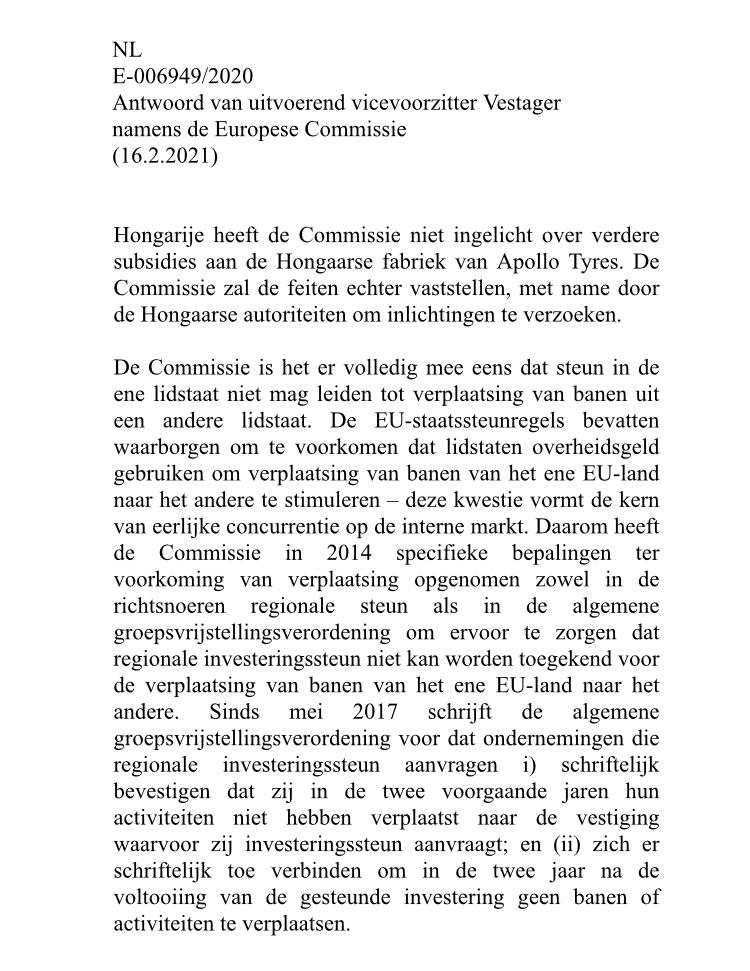 Op mijn vragen met @tbwberendsen @a_jongerius antwoordt Eurocommissaris @vestager dat ze onderzoek instelt naar nieuwe Hongaarse subsidies aan @apollotyres.