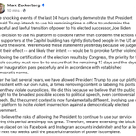 We believe the risks of allowing President Trump to continue to use our service during this period are simply too great, so we are extending the block we have placed on his Facebook and Instagram accounts indefinitely and for at least the next two weeks.