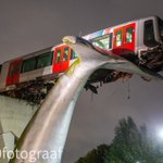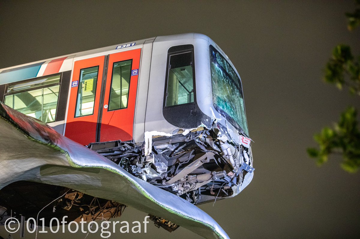 +3Bij metrostation De Akkers in Spijkenisse is een metro door het stootblok heengereden. Het treinstel bungelt zo'n 8 meter boven de grond en rust op een kunstwerk. Gekeken wordt hoe de metro geborgen kan worden. De metrobestuurder is voor controle naar het ziekenhuis gebracht.