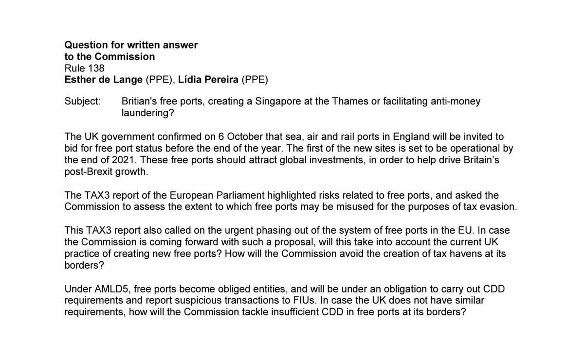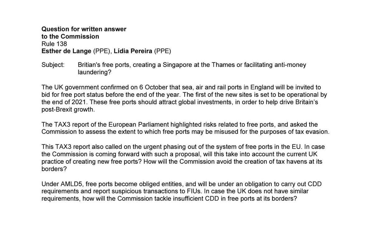 The EP asked the European Commission to reduce number of European free ports. Yet suddenly the UK government suggest setting up new free ports just outside EU waters! Together with @lidiafopereira I posed these questions to the Commission ⤵️