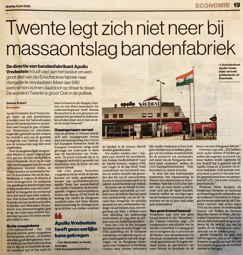 Twente legt zich niet neer bij massaontslag bandenfabriek. Apollo Vredestein Enschede heeft geen eerlijke kans gekregen. #staatssteun @EU_Commission