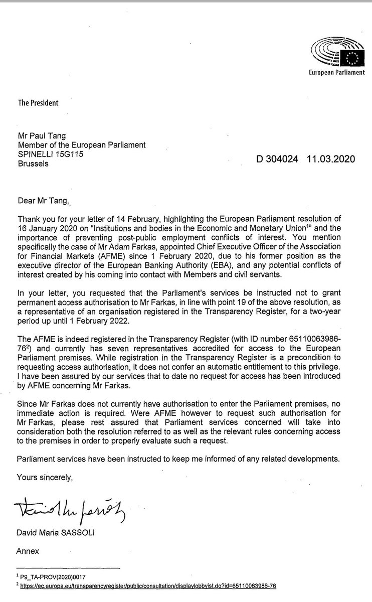 In February I requested @EP_President to act upon Members of Parliament's wish not to grant Mr Farkas a parliamentary access badge. Of course, Sassoli can only give a definite answer once a request has been made, but the subtext of his response is clear enough!