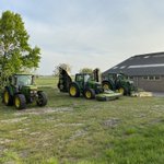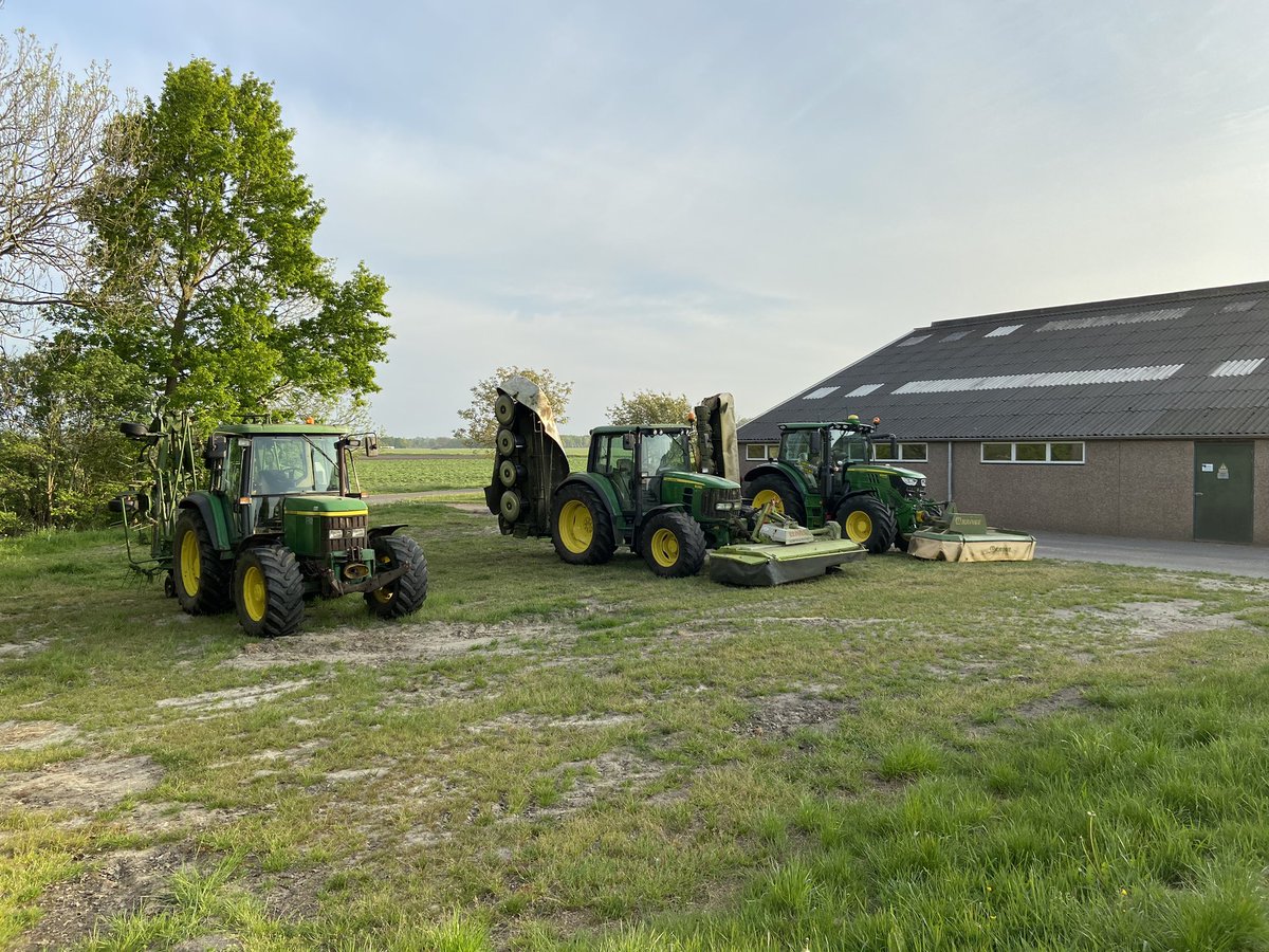 Deze JD’s 6110; 6330 en 6130R (gehuurd) hebben vrijdag 45ha gemaaid, gisteren aan de bult. Perfecte omstandigheden en mooie 1e snede 👍