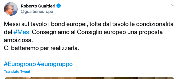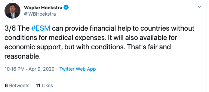 +1Italian and Dutch finance ministers apparently participated to two different #eurogroup's: one says #ESM conditionality is out of the table and #eurobonds remain an option, the other one says there will be ESM conditionality.