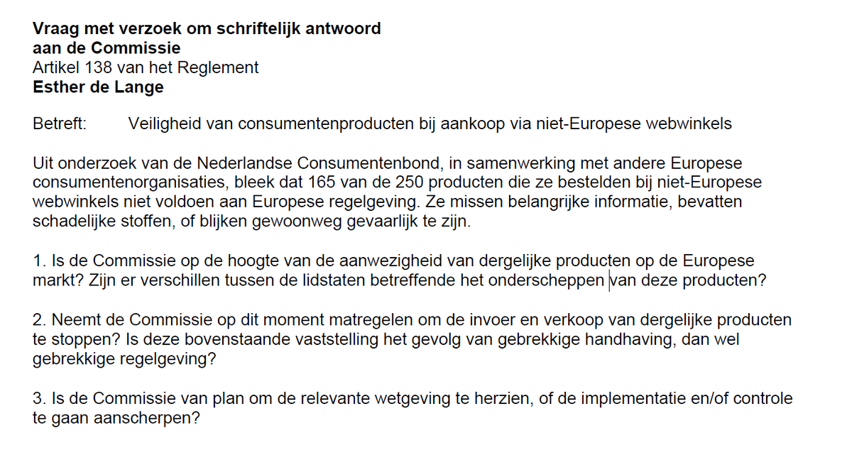 Missende info, schadelijke stoffen of gewoonweg gevaarlijk - met producten uit niet-Europese webwinkels blijkt vaak iets mis. Kernvraag: waarom zijn ze dan op onze markt?! Schiet wetgeving tekort? Kwestie van handhaving? controle? In elk geval reden voor spoedvraag aan Commissie