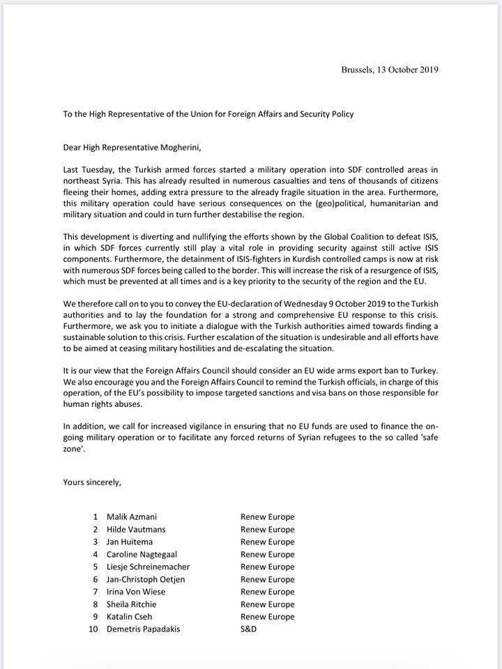 Het Turkse geweld in Syrië zet de veiligheid in de regio + onze veiligheid op het spel. Zojuist heb ik een brief gestuurd aan @FedericaMog, mede gesteund door 220+ Europarlementariërs met oproep om als EU alles te doen om het geweld te stoppen. Aan de zijlijn staan = geen optie.