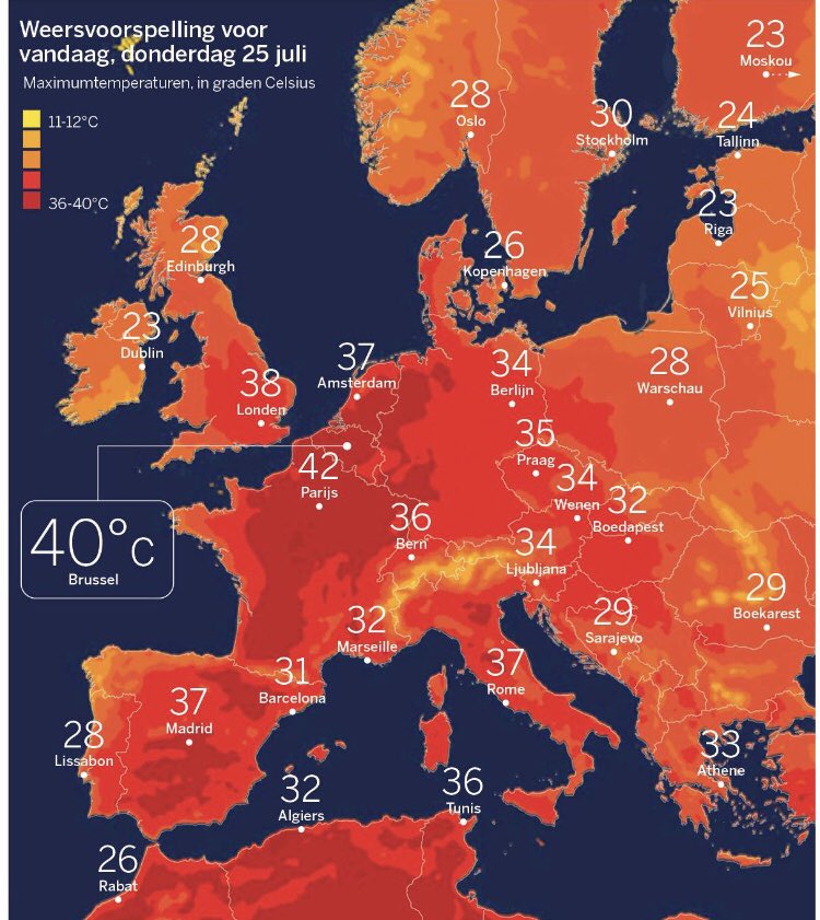 Voor ‘verkoeling’ moet je vandaag naar Marseille, Barcelona of Lissabon... Net als ik gewoon nog aan het werk in de Benelux? Schaduw opzoeken, genoeg drinken, lager tempo en vooral: zie naar elkaar om! (Afbeelding: De Standaard)