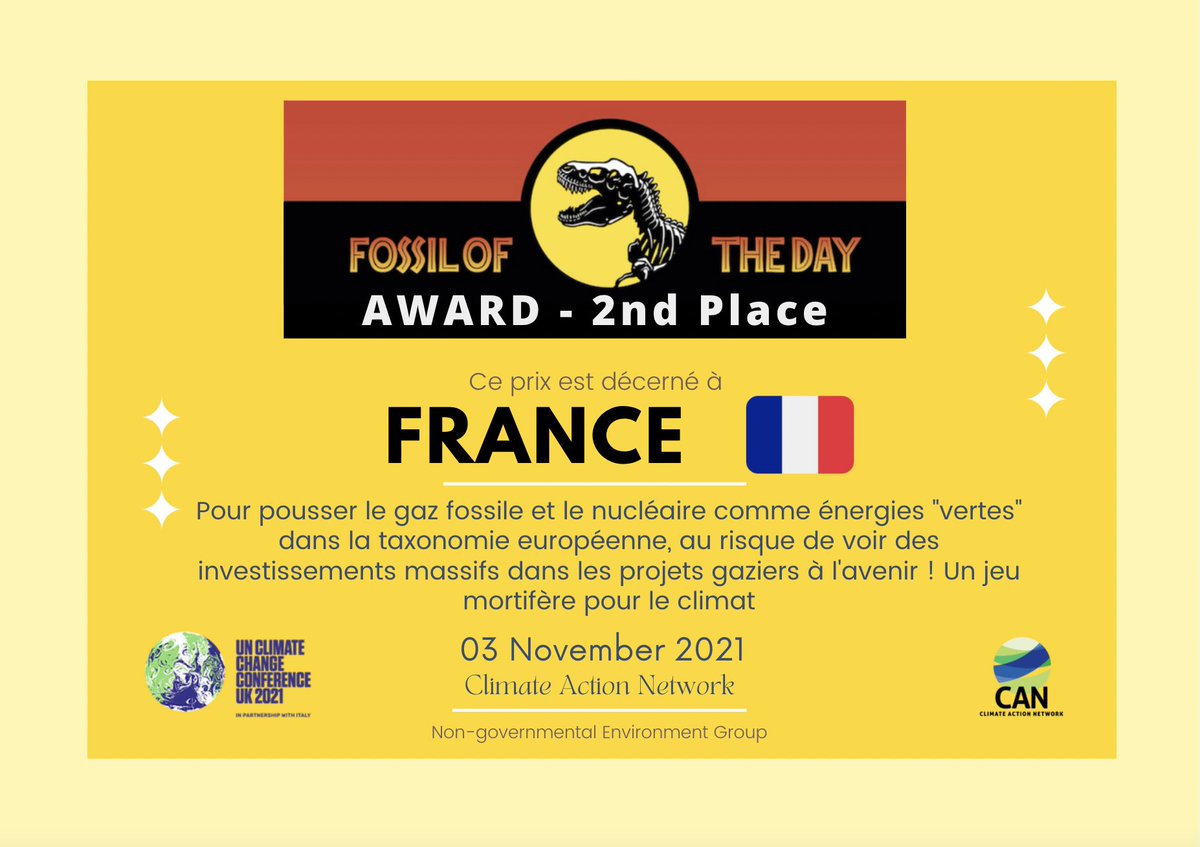 Et le #FossilOfTheDay 🦖 de la #COP26 est décerné à... LA FRANCE