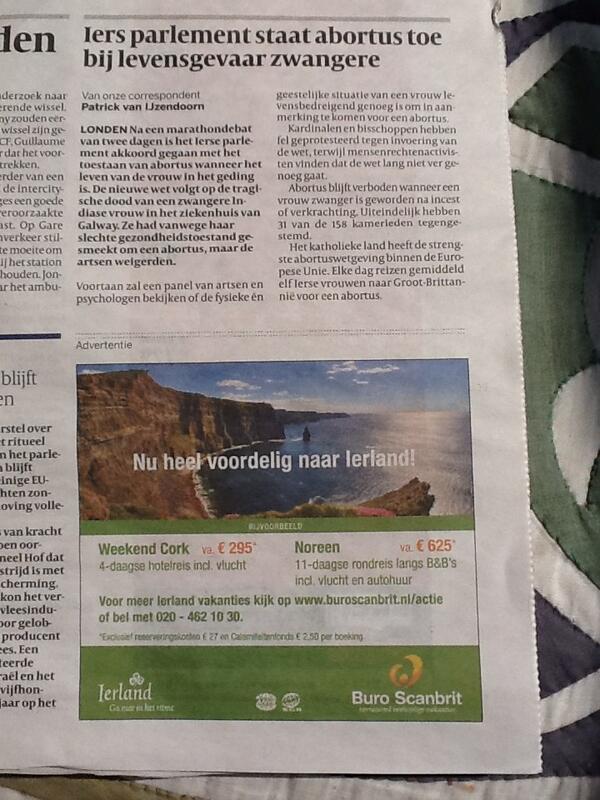 De opmaker vd @volkskrant had er plezier in: 'Iers parlement staat abortus toe / nu heel voordelig naar Ierland'