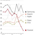 This is a graph of mobile phone sales over recent years. The red line is an indicator of how sales have fallen since US sanctions were imposed on Chinese firm Huawei.