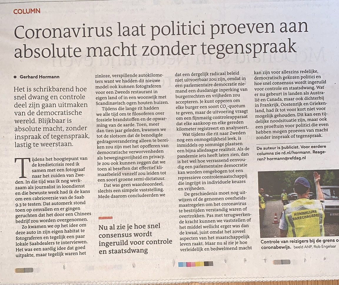 ‘Als de pandemie iets heeft laten zien, dan is het wel hoe verrassend eenvoudig een parlementaire democratie kan worden omgebogen tot een representatieve controlemaatschappij die ingrijpt in individuele keuzes en vrijheden.’ 👇
