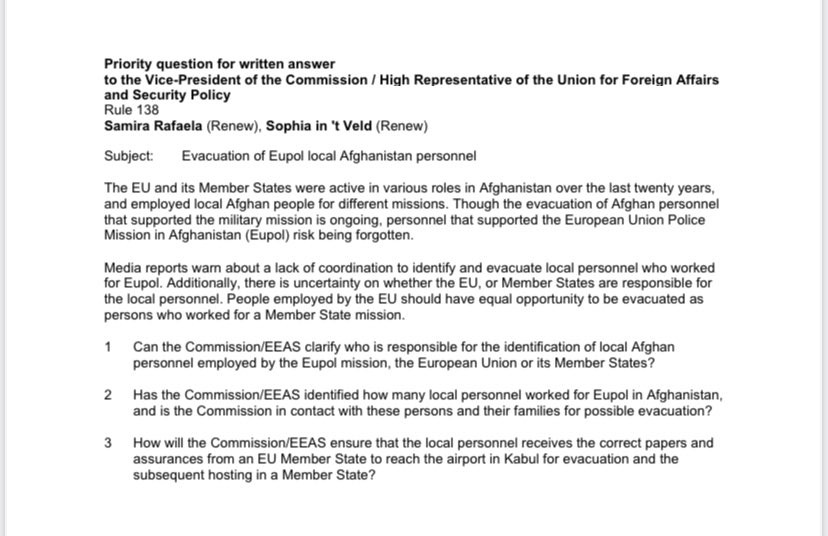 Local personnel that supported the EU police mission in #Afghanistan risk being forgotten. It is unclear who is responsible for their evacuation, and which Member State will host them. Together with @SophieintVeld , I’ve asked questions to address this dire situation.👇🏽