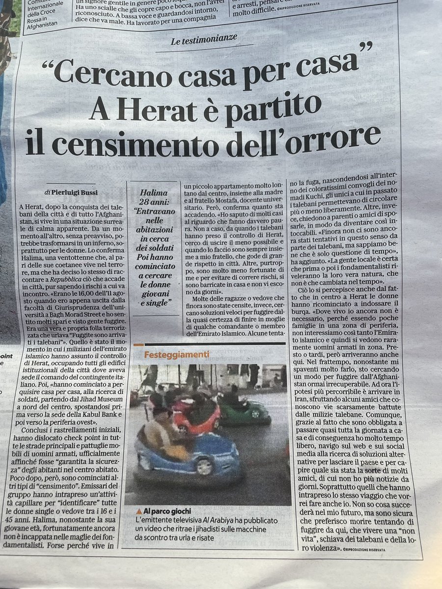 Helaas is het contrast tussen de Taliban woordvoerders op de persconferentie en de harde realiteit enorm. Een jonge vrouw in #Herat deed gisteren ondanks de risico’s haar verhaal tegenover de #Repubblica ‘Ze zoeken huis voor huis’. #preoccupante #worrying