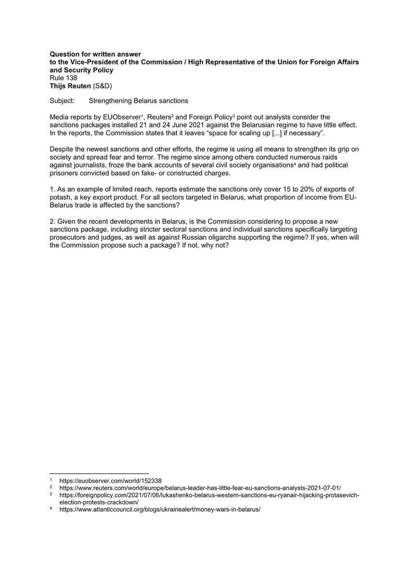 Vandaag heb ik @EU_Commission gevraagd vast voorstellen zwaardere sancties tegen Loekasjenko voor te bereiden. Nog teveel ruimte. 1️⃣ Alle handelsinkomsten afsnijden en 2️⃣ meer individuen op sanctielijst zoals magistraten die de duizenden fake strafzaken runnen. #StandWithBelarus