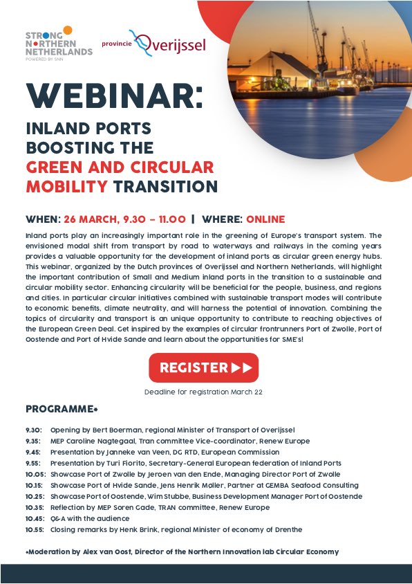 Vrijdag ben ik in het Oosten van ons land (online). Wil jij er ook bij zijn? Ik zal spreken over "Inland Ports boosting the green mobility transition". En we gaan mooie showcases zien van: @PortofZwolle🇳🇱 @havenoostende🇧🇪 @HvideSandehvn🇩🇰Aanmelden: tinyurl.com/b3zejd6z