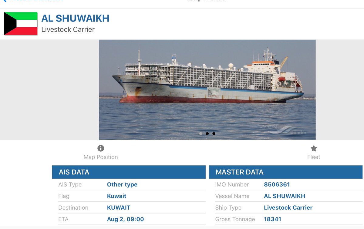 Heel erg slecht nieuws voor de 70.000 schapen aan boord van dit schip. Nog 2 weken varen bij extreem hoge temperatuur 😭 #StopLiveTransport #BanLiveExport #AlShuwaikh