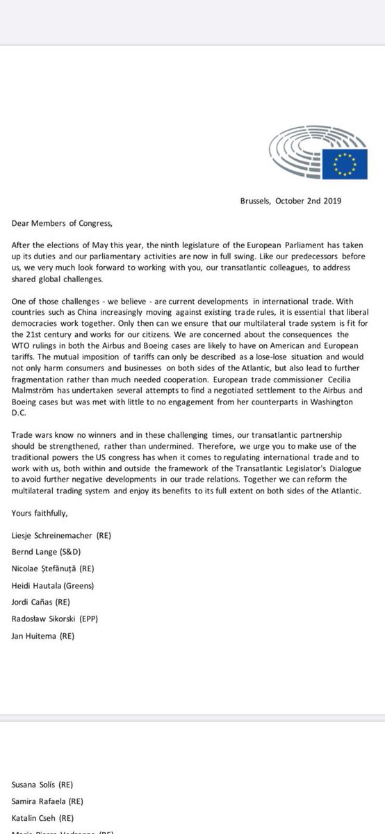 +1Handelsoorlogen kennen alleen verliezers! Bedrijven & burgers profiteren van een open markt en internationale samenwerking, dus een verslechtering v/d transatlantische handelsrelatie is slecht nieuws! Daarom is op mijn initiatief deze brief 👇🏻 naar het US Congress gestuurd 2/2