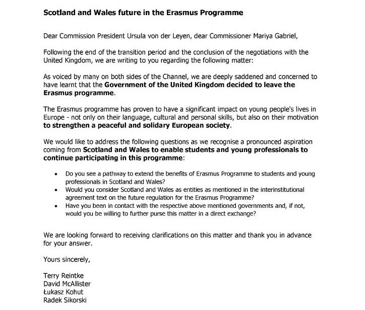 Samen met 144 MEPs heb ik de Europese Commissie gevraagd te kijken naar de mogelijkheden om studenten uit Wales en Schotland in Erasmus+ te houden 🏴🏴 Dank @TerryReintke voor het initiatief!