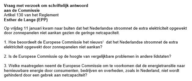 Schriftelijke vragen gesteld aan @EU_Commission n.a.v. het nieuws dat het Nederlandse stroomnet de extra elektriciteit opgewekt door zonnepanelen niet aan lijkt te kunnen op sommige plekken.