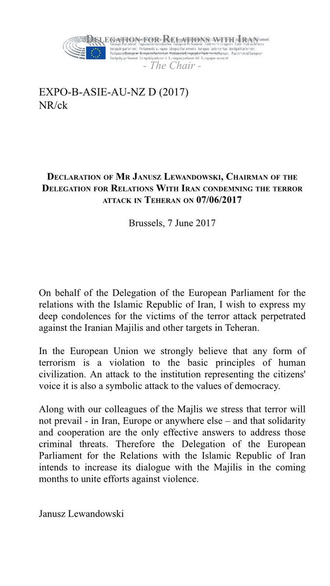 European Parliament Delegation for Relations w #Iran (via chair) condemns attacks #IranParliament and expresses condoleances to the victims