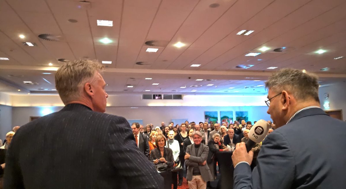 Volle bak bij Nieuwjaarsreceptie van @FVDZuidHolland in Leiden. Ook @FvD_EP was er. Hier Rob Roos en ikzelf. Over @TimmermansEU met de klimaatbiljoenen; @guyverhofstadt met de EU superstaat. Dank aan de aanwezigen, bron van inspiratie. We gaan er tegenaan!