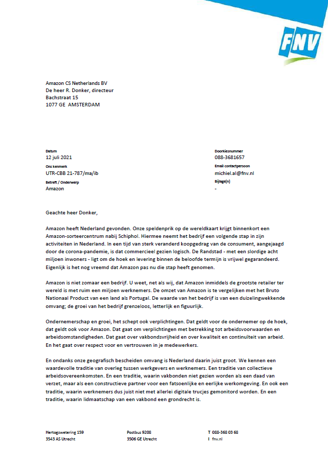 Amazon opent binnenkort een sorteercentrum in Nederland. Samen met @FNV @uniglobalunion en @a_jongerius roep ik @amazon op de rechten van hun werknemers te waarborgen.