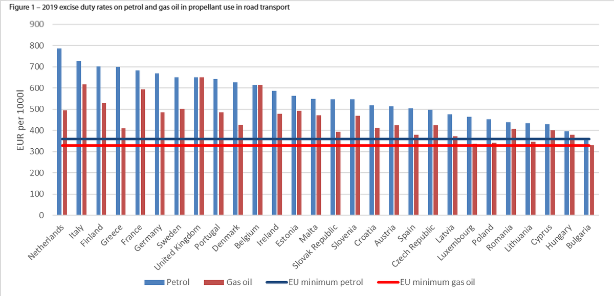 Let wel: de EU stelt slechts minimumtarieven vast. Lidstaten mogen de belastingen / accijnzen dus ophogen. De huidige minima zijn zo laag dat bijna alle lidstaten dat ook doen. Luxemburg gaat voor diesel echter amper voorbij het minimum - vandaar de lange rijen aan de pomp.