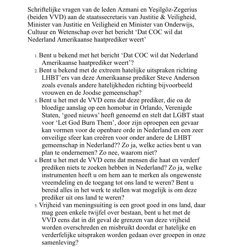 +1Wat de VVD betreft is in ons land geen ruimte om haat te prediken en geweld te verheerlijken. Zie ook vorige tweet. Hierbij de Kamervragen die ik samen met collega @MalikAzmani gesteld heb >>>